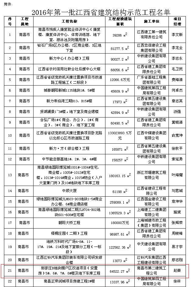 由南昌市第二建筑工程公司承建的郭家莊B地塊棚戶區(qū)改造項(xiàng)目(安置房)5#、6#、7#、8#樓及地下車庫工程獲“2016年第一批江西省建筑結(jié)構(gòu)示范工程” [摘自贛建質(zhì)監(jiān)字[2016]1號]。