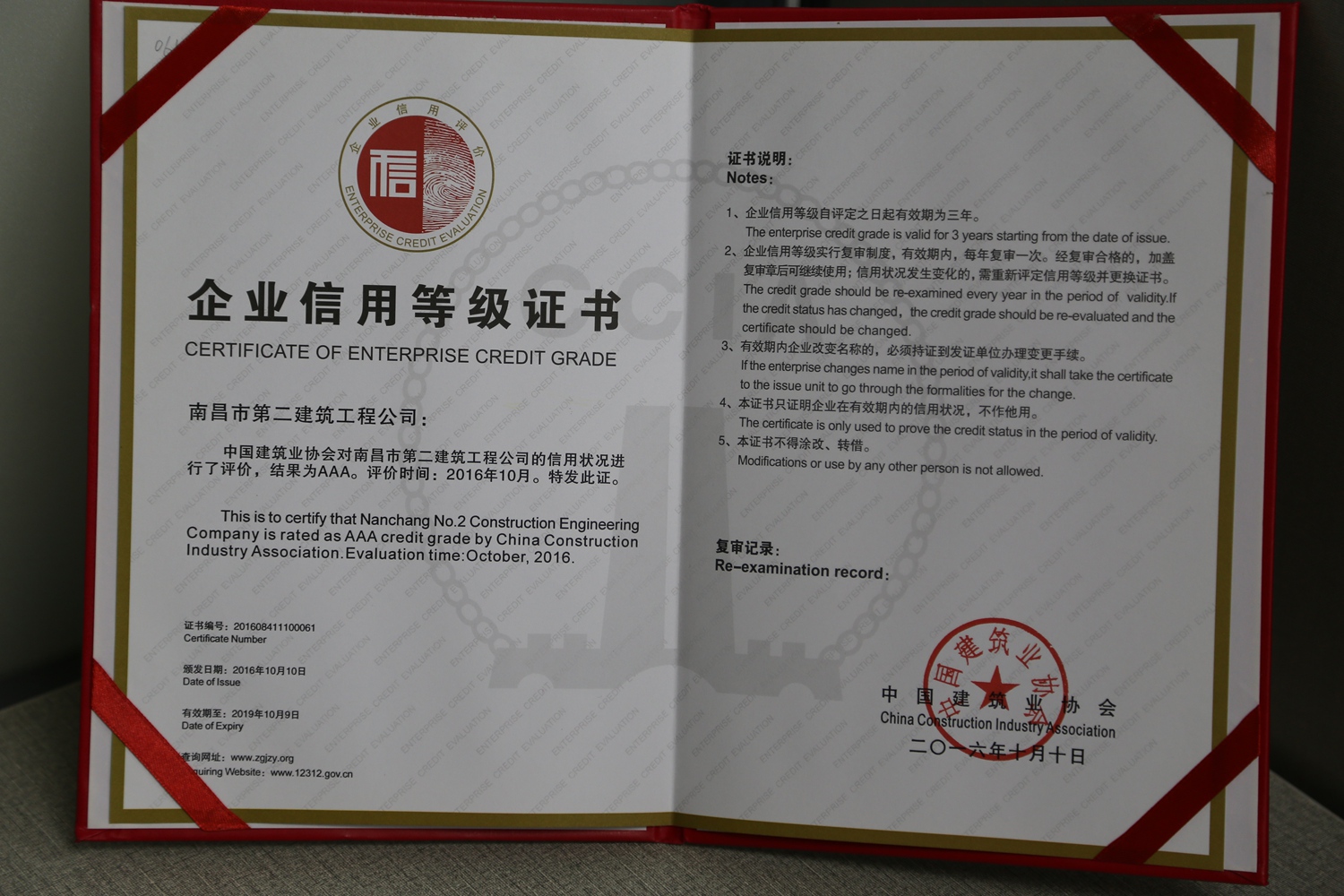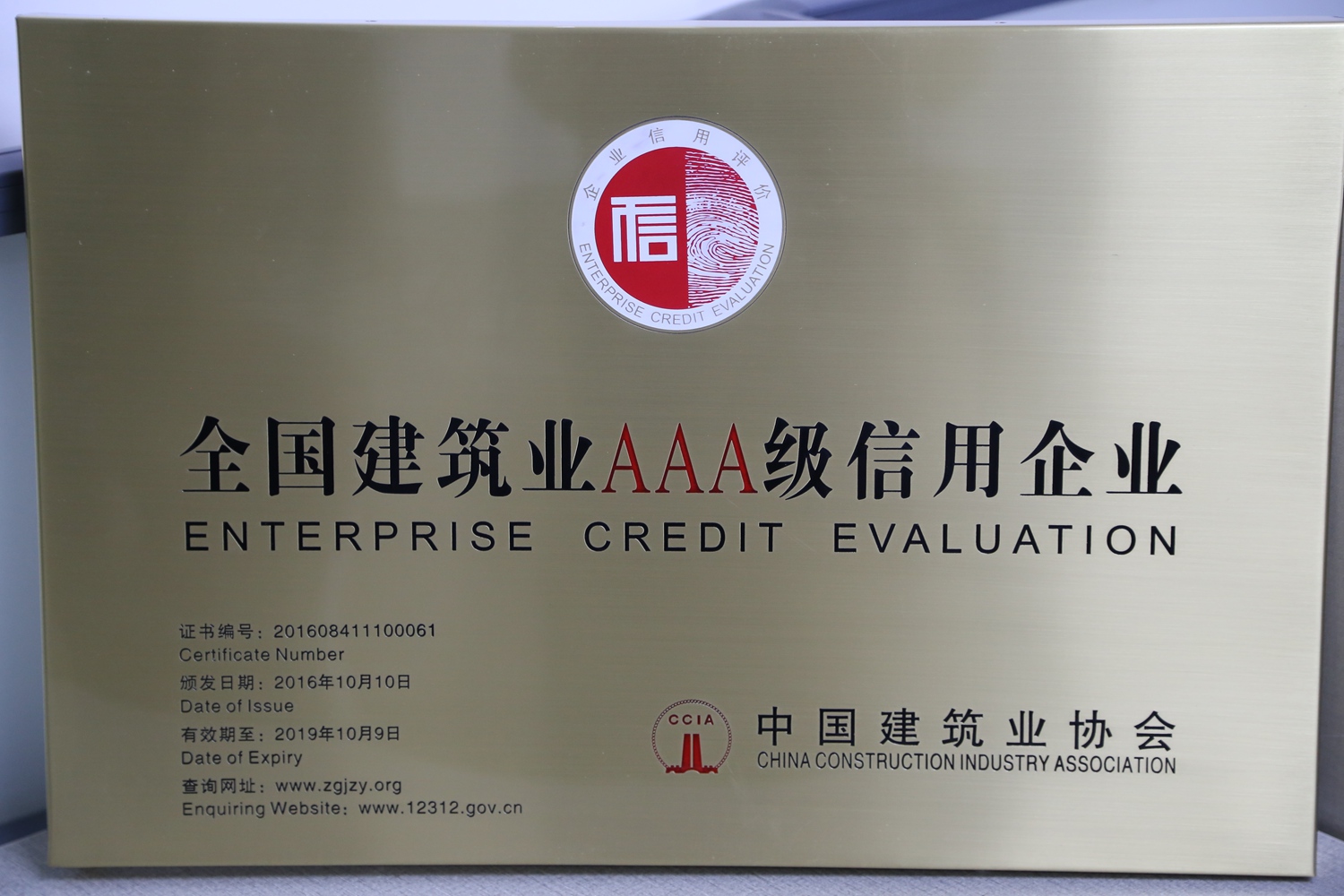 企業(yè)信用等級是由中國建筑業(yè)協(xié)會經(jīng)審核、篩選和評定而確定的,有效期3年,每年復審一次。由于公司一直本著誠信、服務、質(zhì)量為上的原則,獲得了中國建筑業(yè)協(xié)會及社會大眾的認可,2016年10月公司再度榮獲“AAA級信用企業(yè)”的榮譽稱號。這個全國建筑行業(yè)都為數(shù)不多的榮譽是對我們企業(yè)的肯定及嘉獎,讓我們樹起信譽旗幟,再創(chuàng)輝煌,攜手走得更好、更遠。