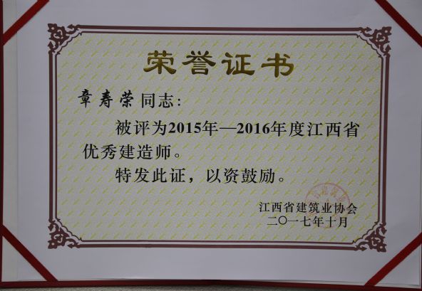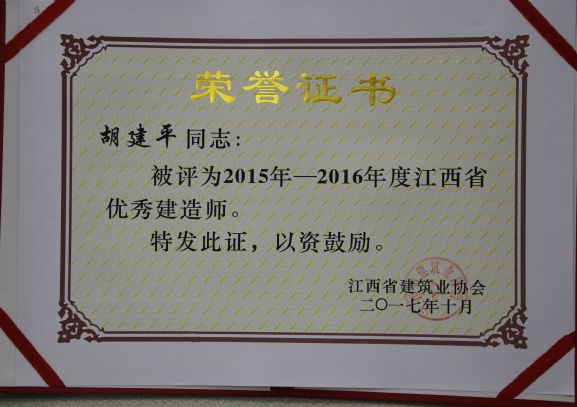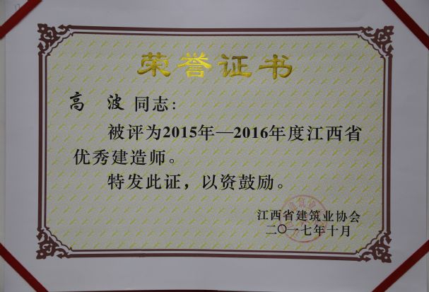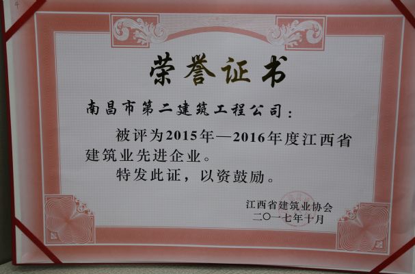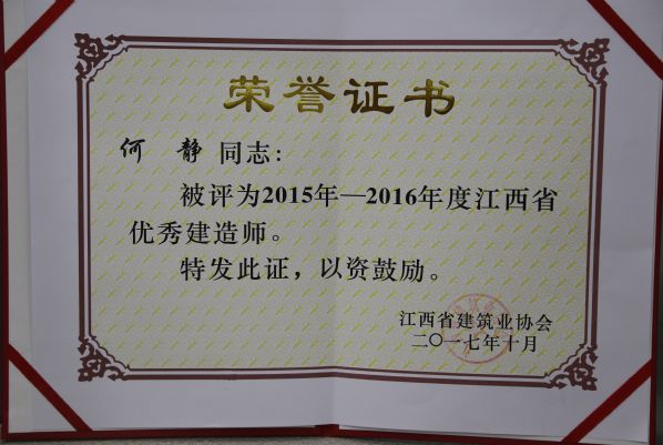 江西省建筑業(yè)協(xié)會(huì)對(duì)公司頒發(fā)了2015-2016年度江西省建筑業(yè)先進(jìn)企業(yè)榮譽(yù)稱號(hào),對(duì)公司建造師何靜、胡建平、高波、章壽榮頒發(fā)了2015-2016年度江西省優(yōu)秀建造師榮譽(yù)稱號(hào)。