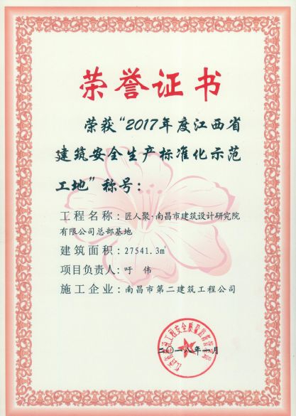 公司承建的郭家莊地塊棚戶區(qū)改造項目(安置房)工程、匠人聚.南昌市建筑設計研究院有限公司總部基地榮獲2017年度江西省建筑安全生產標準化示范工地稱號。
