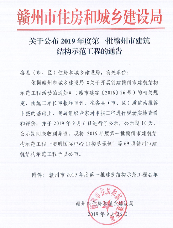 公司承建的贛州.綠地國際博覽城配套商住小區(qū)三期項目榮獲贛州市2019年度第一批建筑結(jié)構(gòu)示范工程。
