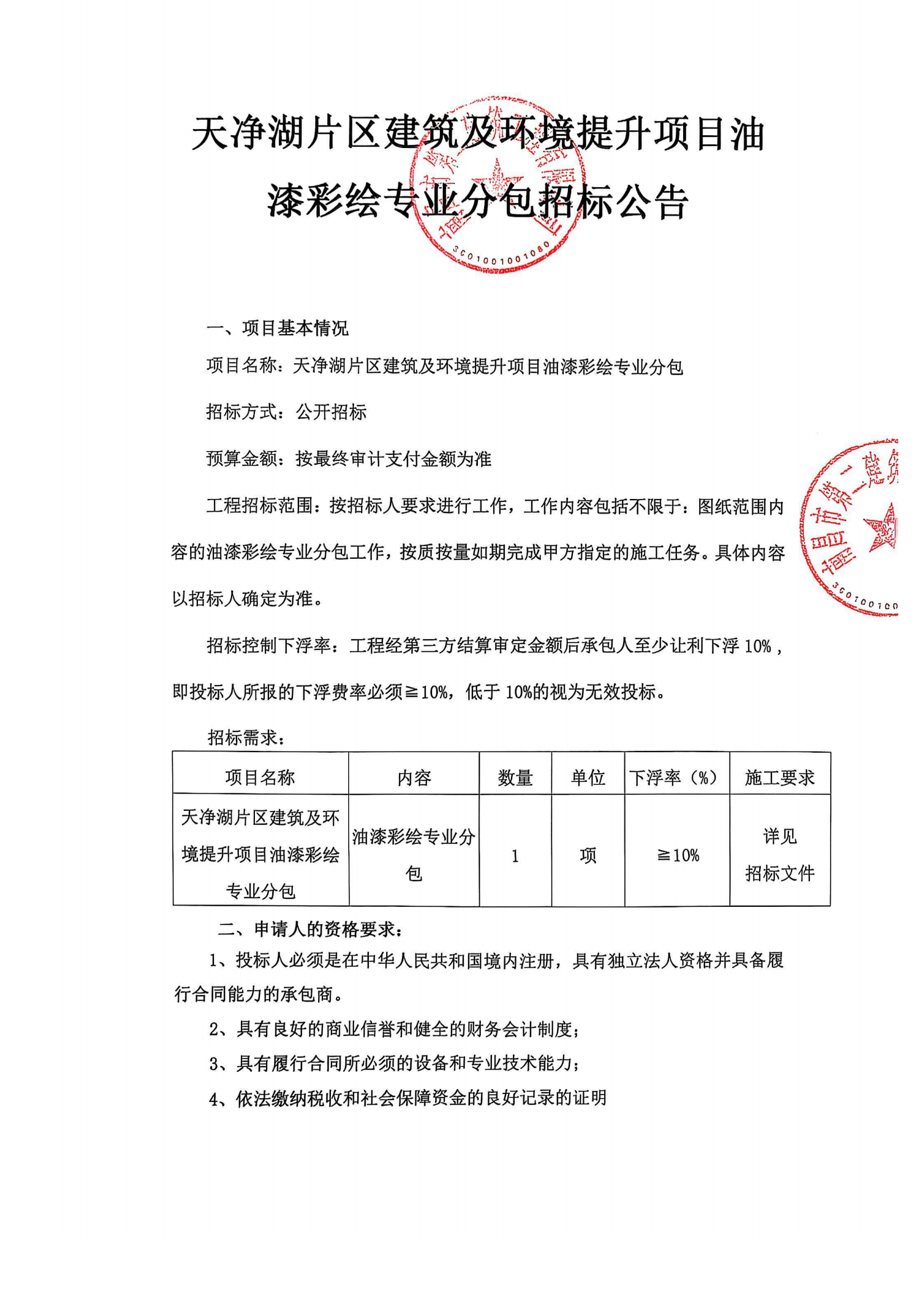 天凈湖片區(qū)建筑及環(huán)境提升項目油漆彩繪專業(yè)分包招標公告